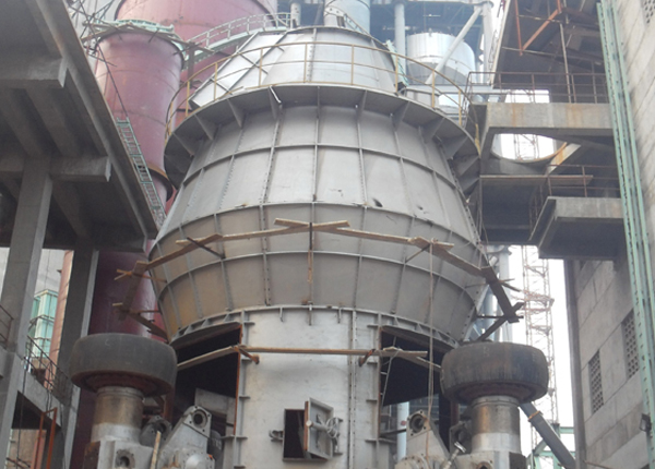 料床,物料同時受到磨盤上多個磨輥的碾壓,并被粉碎。在離心力的連續(xù)驅(qū)動下物料不斷向磨盤外緣運(yùn)動,離開磨盤的物料遇到通過風(fēng)環(huán)進(jìn)入磨內(nèi)的熱氣體并隨之上升,經(jīng)磨機(jī)中部殼體進(jìn)入到分離器中,在此過程中物料與熱氣體進(jìn)行了充分的熱交換,水分迅速被蒸發(fā)。選粉機(jī)控制著輥磨出口的成品細(xì)度,大于規(guī)定尺寸的顆粒被分離,并落回至磨盤,滿足細(xì)度要求的物料通過選分機(jī)進(jìn)入成品倉。